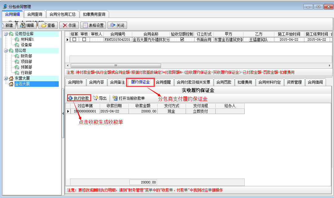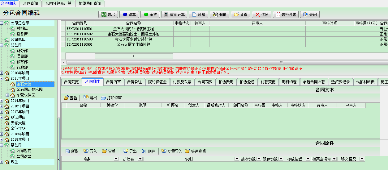在【合同編輯】中左半部分是合同的分類,分包合同也是按【項目維護(hù)】進(jìn)行分類管理的。一個項目下可以建立多個合同,窗口的右上部分是合同列表,一行信息代表一個合同。右下部位是當(dāng)前合同相關(guān)的內(nèi)容:【合同附件】、【合同內(nèi)容】、【合同備注】、【履約保證金】、【合同提醒】、【合同付款及相關(guān)發(fā)票】、【合同罰款】、【扣繳費(fèi)用】、【合同材料約定】、【資質(zhì)管理】、【合同借閱】。