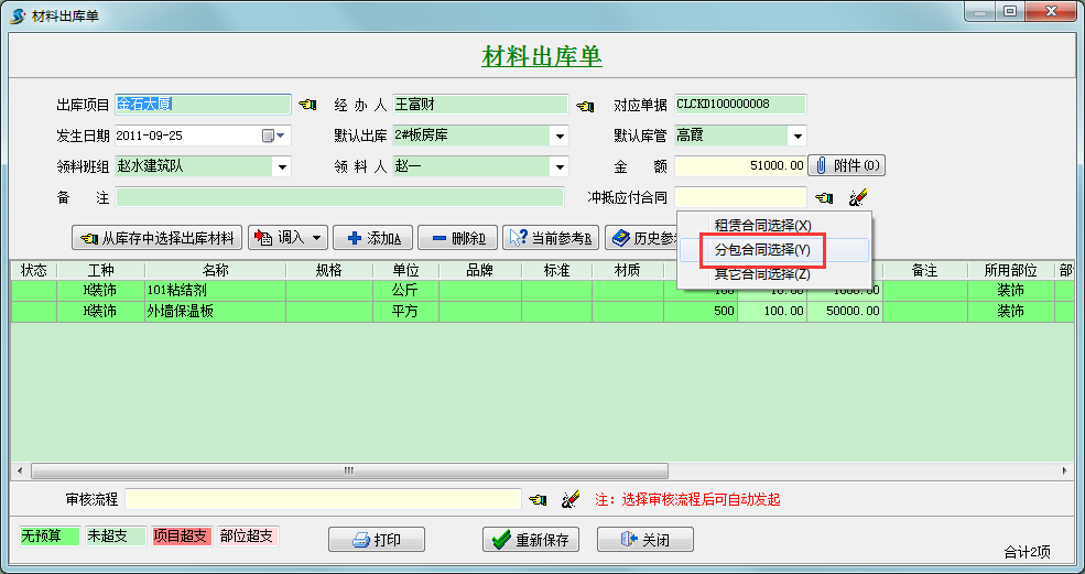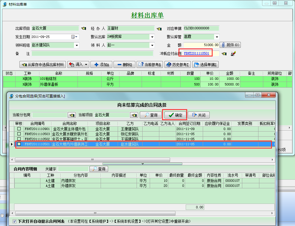 選定對應合同后,點擊保存,這樣就可以實現(xiàn)分包工程款的沖抵。