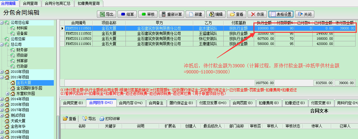 沖抵后(沖抵金額51000),得到的待付款金額為原待付款金額減去沖抵甲供材的金額,即90000-51000=39000,如下圖所示,