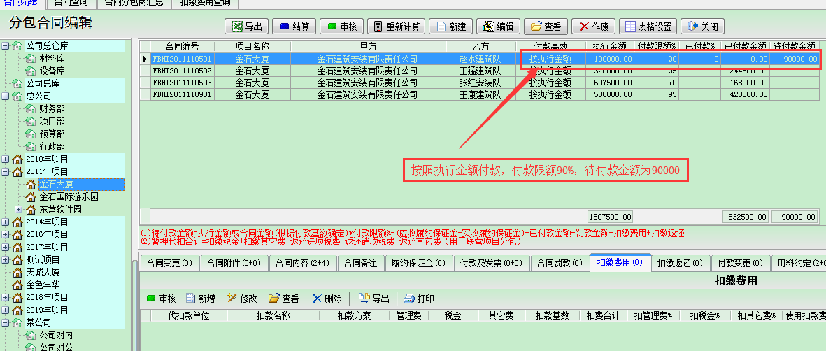 在工程項目管理中,工程款含甲供材費用的情況經(jīng)常會遇到,若總包方對外分包而且分包款也是包含甲供材費用的話,同樣的在分包管理中就應該在分包工程款中扣除相應的甲供材費用。或者我方給分包商提供材料。為此金石工程項目管理軟件中做出相應的解決方案,以下為示例說明