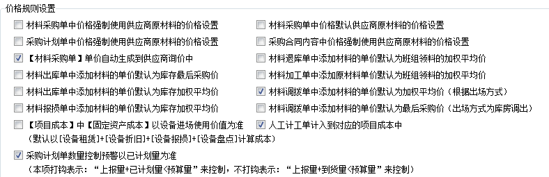 4、價(jià)格規(guī)則設(shè)置,里面包括材料計(jì)劃單、材料采購(gòu)單及采購(gòu)合同中材料價(jià)格幾種選擇方式,如強(qiáng)制使用原材料價(jià)格和默認(rèn)使用原材料的價(jià)格。材料采購(gòu)單單價(jià)自動(dòng)生成到供應(yīng)商詢價(jià)中,材料出庫(kù)單中添加材料的單價(jià)默認(rèn)為庫(kù)存最后采購(gòu)價(jià),材料退庫(kù)單中添加材料的單價(jià)默認(rèn)為班組領(lǐng)料的加權(quán)平均價(jià),材料調(diào)撥單中添加材料的單價(jià)默認(rèn)為加權(quán)平均價(jià)(根據(jù)出場(chǎng)方式)等開(kāi)關(guān)。特別的,采購(gòu)計(jì)劃單中,若以“上報(bào)量+已計(jì)劃量<預(yù)算量”來(lái)控制,需要開(kāi)啟此開(kāi)關(guān)。