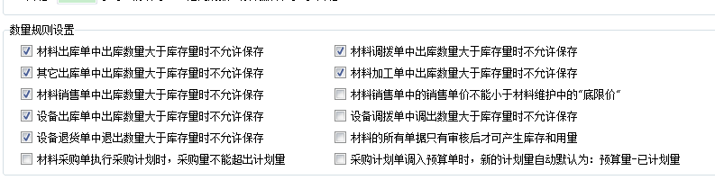 5、數(shù)量規(guī)則設(shè)置,在此開(kāi)關(guān)中主要涉及,出庫(kù)數(shù)量大于庫(kù)存時(shí)是否允許保存。比如材料出庫(kù)單中出庫(kù)數(shù)量大于庫(kù)存時(shí)不允許保存。關(guān)于計(jì)劃單的開(kāi)關(guān),如材料采購(gòu)單執(zhí)行采購(gòu)計(jì)劃時(shí),采購(gòu)量不能超過(guò)計(jì)劃量,采購(gòu)計(jì)劃單調(diào)入預(yù)算是,新的計(jì)劃量自動(dòng)默認(rèn)為:預(yù)算量-已計(jì)劃量。