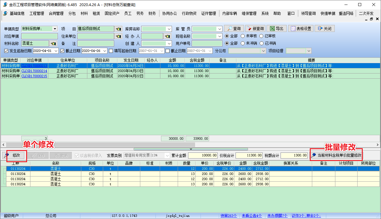 選擇其中一個單據,點擊下方要修改的材料明細,點擊批量修改。如下圖