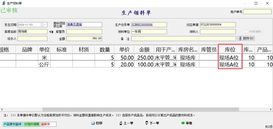 生產增加庫位:應用于庫房按實際材料種類進行分類存放,統計該庫位材料的收支存情況