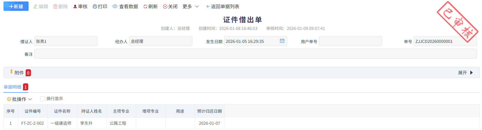 證件歸還時,做證件歸還單,如下圖所示,