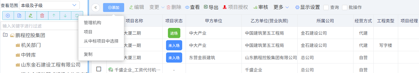 建立項目時,左側選擇項目節點,然后點擊上方添加按鈕,可以建立管理機構,也可以建立項目。如果建立項目,可以手動輸入,也可以選從中標項目中選擇,如下圖所示: