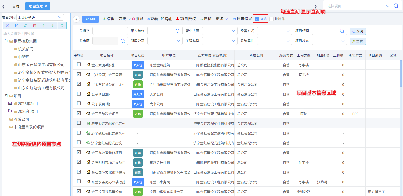 項目立項即生產立項,項目中標后在此界面建立項目,左側為樹狀結構項目節點,右側上方為常用按鈕和查詢區域,下方為項目的基本信息,如下圖所示: