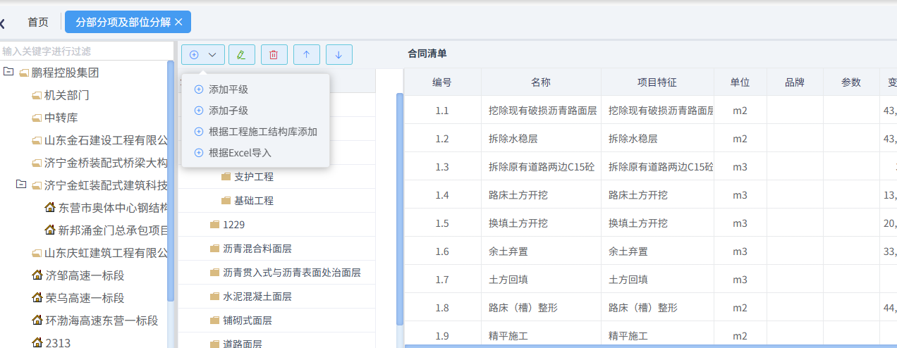 分部分項可以手動添加,也可以從結構庫中添加,也可以excel批量導入,如下圖所示:
