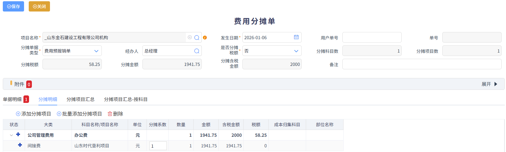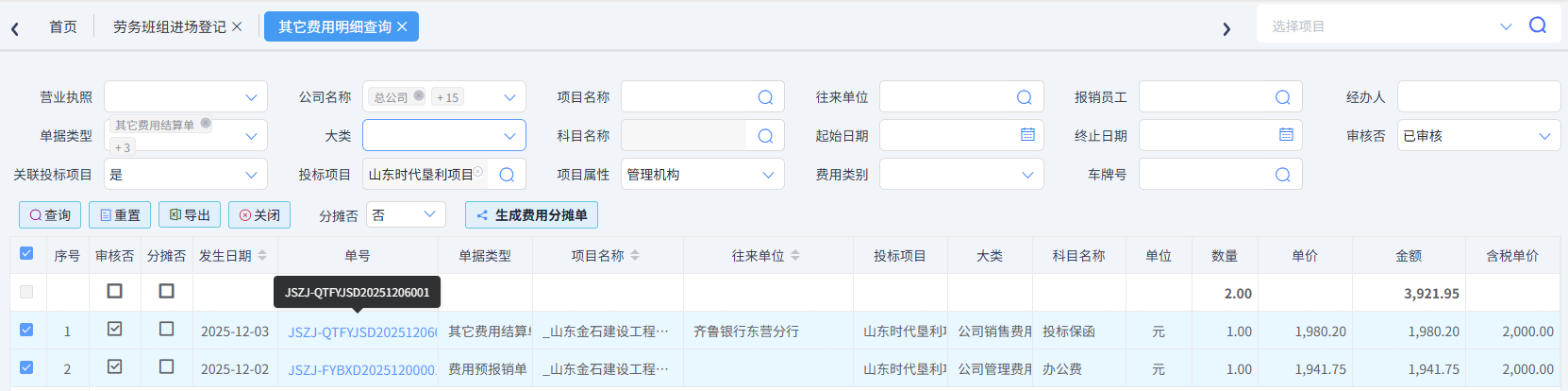 勾選(必須是同單據類型)后點擊生成費用分攤單,在分攤明細中,顯示結轉到中標項目的費用內容和金額。如下圖所示: