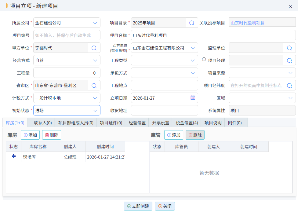 選擇一個項目中標項目,點擊確定后,彈出創建項目窗口,如下圖所示: