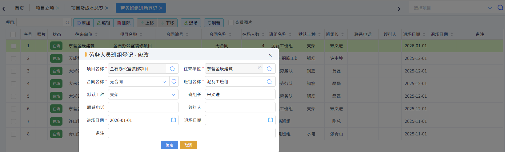 勞務班組進場登記需要在班組進場時填寫,如下圖所示: