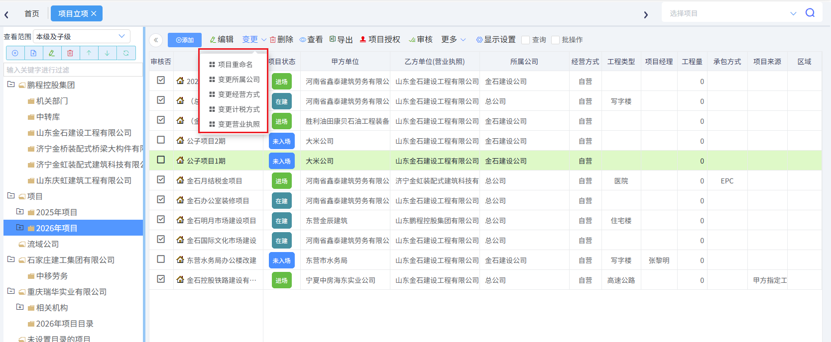 如有項目信息變更,可通過變更按鈕實現,可以重命名、變更所屬公司、經營方式等,如下圖所示: