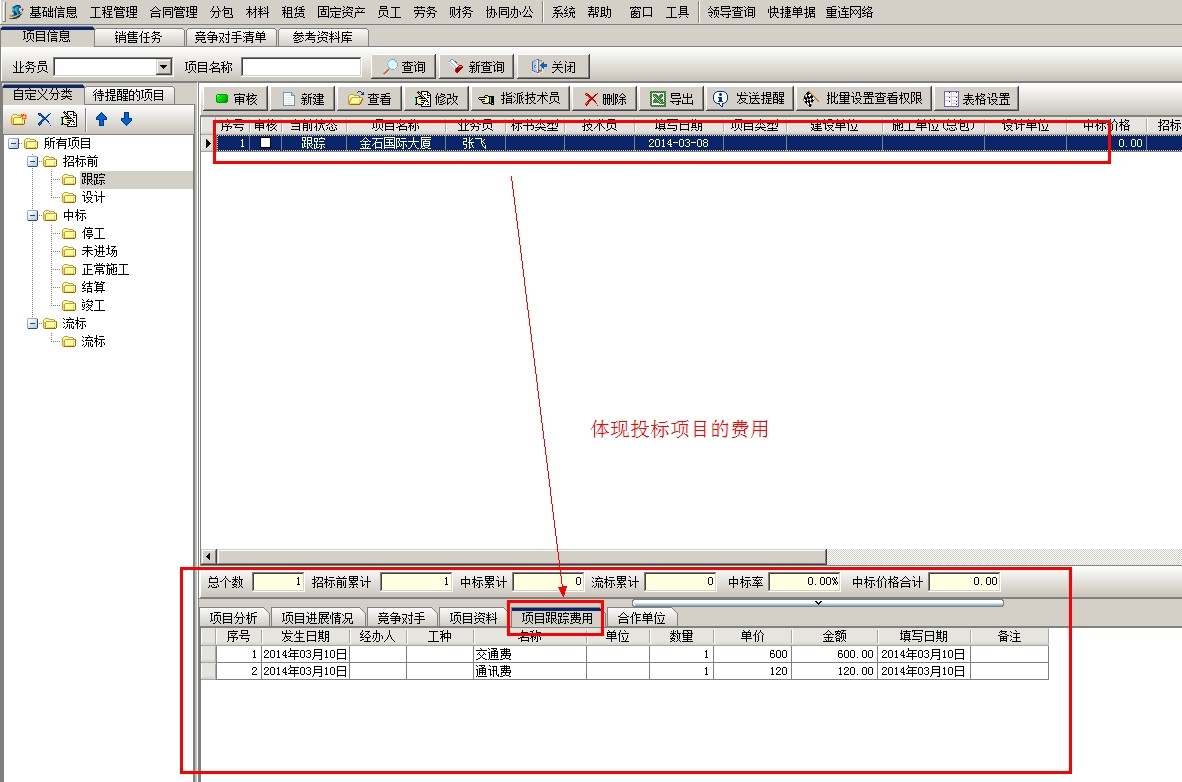 以公司的“市場部”或“銷售部”來進行前期費用的承擔。如果項目沒有中標,則前期跟蹤費用自然歸屬到該部門下,如果中標通過在【項目維護】中新建項目,從項目開拓中引入,并確認結轉費用即可。