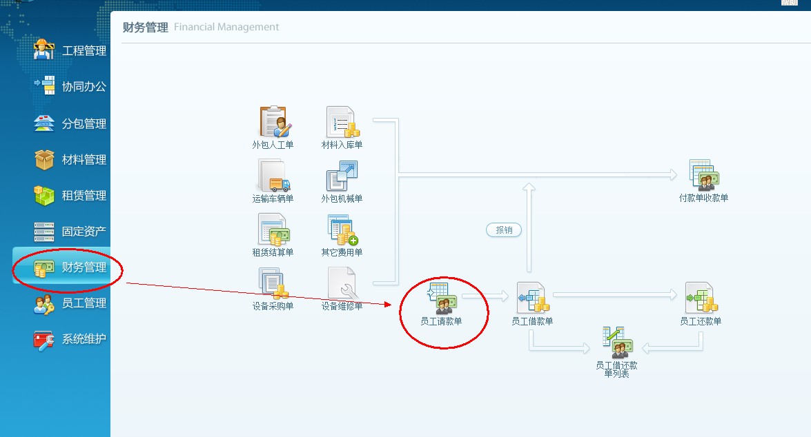 4、下面查詢一下業務員借款,點擊財務管理,打開員工借還款單列表