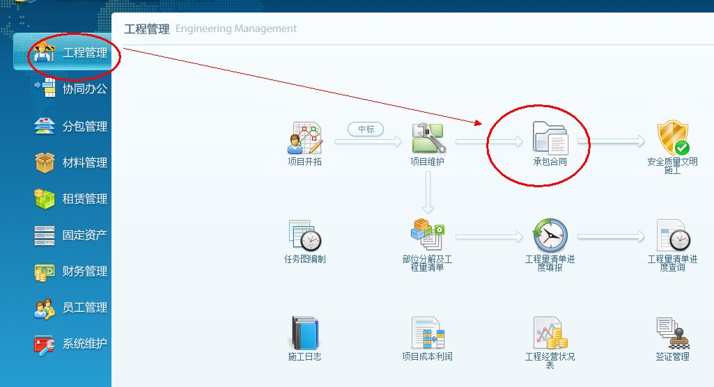 3、如果是項目中標, 項目新建之后,接著建立承包合同,打開工程管理,點擊承包合同